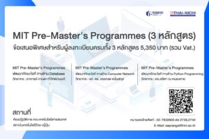 โครงการ MIT Pre-Master’s Programmesสถาบันเทคโนโลยีไทย-ญี่ปุ่น (TNI)โดยคณะเทคโนโลยีสารสนเทศ หลักสูตร วทม. (เทคโนโลยีสารสนเทศ)ขอเชิญนักศึกษาระดับปริญญาตรี ปริญญาโท และผู้ที่สนใจพัฒนาทักษะด้าน ITเข้าร่วมเสริมสร้างศักยภาพผ่านหลักสูตรเตรียมความพร้อมล่วงหน้าราคาพิเศษสำหรับผู้ลงทะเบียนครบทั้ง 3 หลักสูตรราคาเพียง 5,350 บาท [...]
